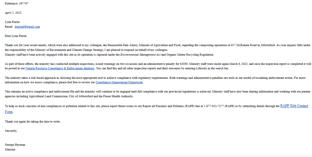 Excerpt from Invitation to the City of Abbotsford to Meet Its Obligations for Good Government Regarding the Rezoning for Commercial Composting at 617 McKenzie Rd (Cc to ALC Minister of Agriculture and Minister of Environment)