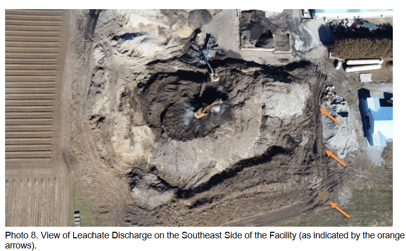 During the inspection, Officer Angus and Officer Howett observed leachate being discharged to ground near the storage and curing area where concrete was removed, on the west side of the Facility and on the southeast side of the Facility (Photos 7 and 8).