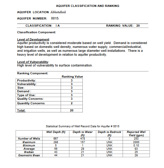 As identified in previous inspection reports (IR#128402 and IR#182205), there are two mapped aquifers located beneath the Facility that are separated by glacial till but likely to be hydraulically connected. The upper aquifer consists of sand and gravel, has a relatively shallow water table (10 m below ground surface), and is highly productive, with many wells pumping at rates greater than 10 L/s. As such, the aquifer was determined to be highly vulnerable to contamination (Attachments 1 and 2).
