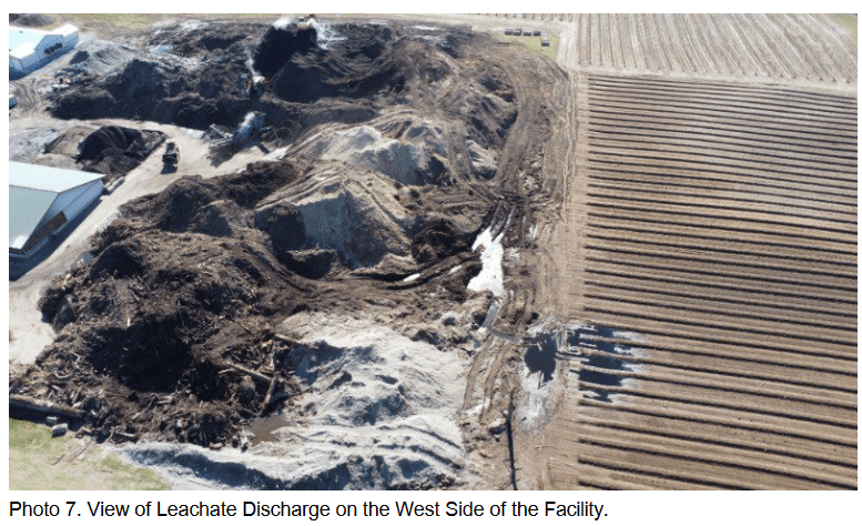 When observing the receiving, storage, processing and curing areas, Officer Angus and Officer Howett observed that there was no leachate collection system designed, constructed, maintained, and operated to reuse or remove leachate. The Senior Environmental Scientist informed Officer Angus that two 70,000 L tanks had been purchased to collect leachate but still needed to be installed.